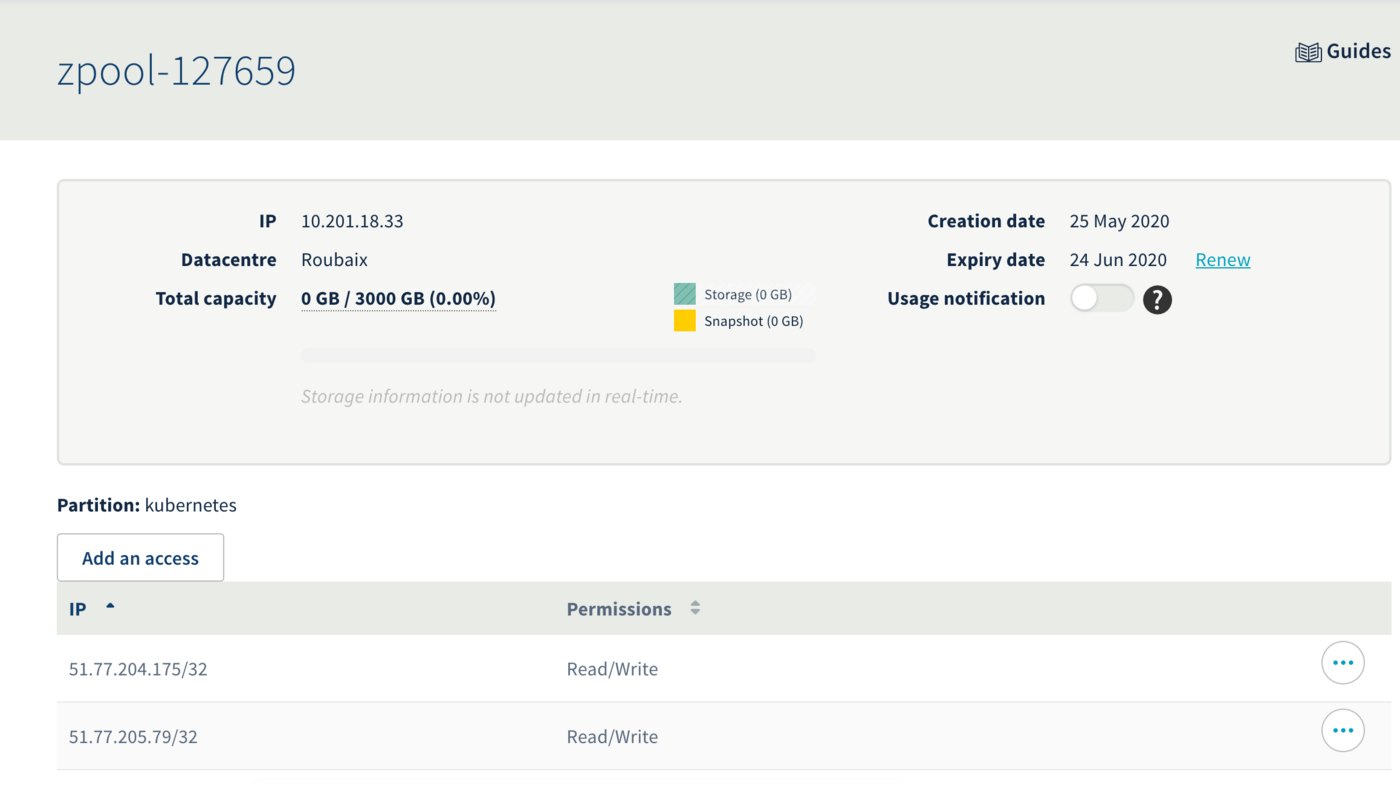 Your NAS-HA can expose multiple partitions, and supports a variety of protocols. Each partition is accessible only from a specific range of IPs. We will create one exposing NFS and make it accessible from your Kubernetes worker nodes.