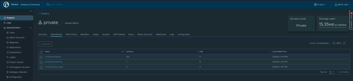 $ docker run -ti --rm ovhcloud/harbor-chartmuseum-migrator --url $HARBOR_URL --username $HARBOR_USER --password $HARBOR_PASSWORD$ docker run -ti --rm ovhcloud/harbor-chartmuseum-migrator --url $HARBOR_URL --username $HARBOR_USER --password $HARBOR_PASSWORD2023/06/28 16:17:32 416 Helm charts to migrate from Chartmuseum to OCI 100% |█████████████████████████████████████████████████████████████████████████████████████████████████████████████████████████████████████████████| (416/416, 20 it/min)2023/06/28 16:38:14 416 Helm charts successfully migrated from Chartmuseum to OCI