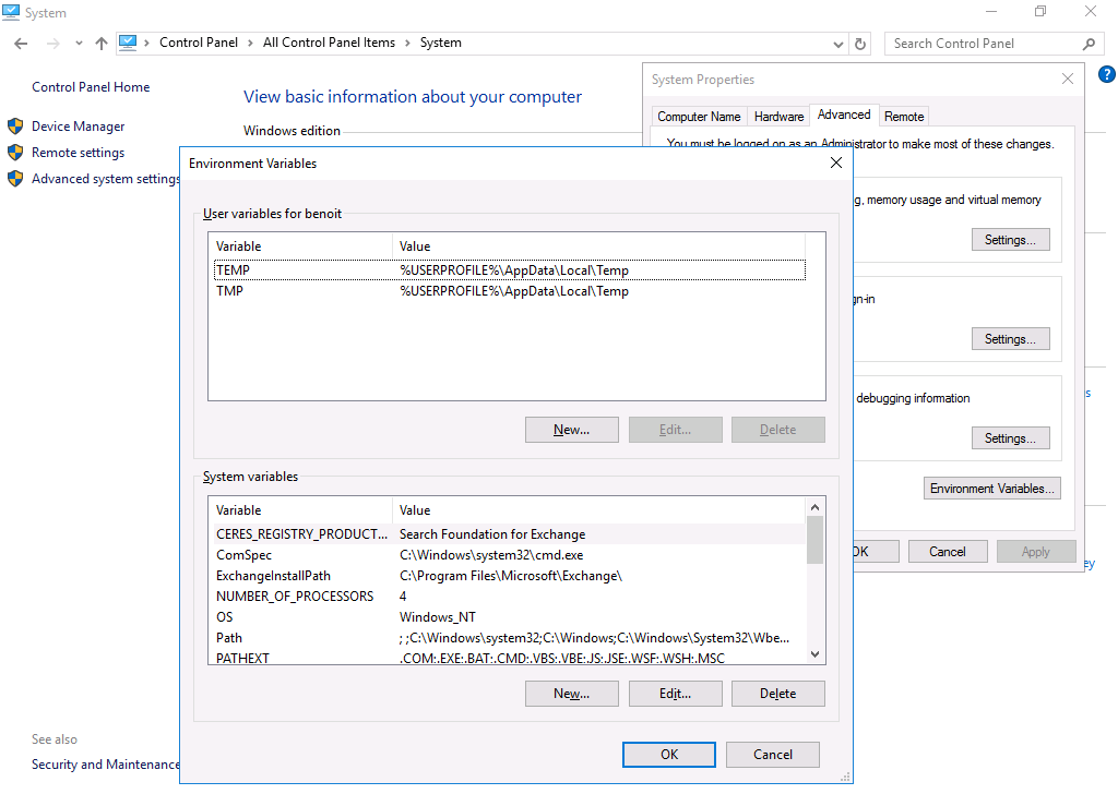 Es posible cargar las variables directamente desde los parámetros del sistema: Panel de configuración > Sistema > Configuración avanzada del sistema > Variables de entorno: