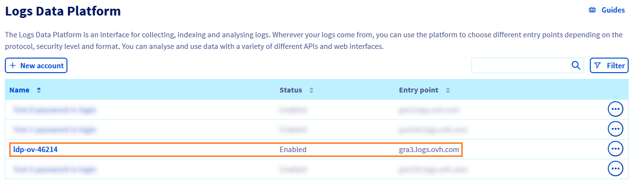 Log in to the OVHcloud Control Panel, go to the Identity, Security & Operations section. In the left-hand menu, select Logs Data Platform then click on the relevant LDP instance.