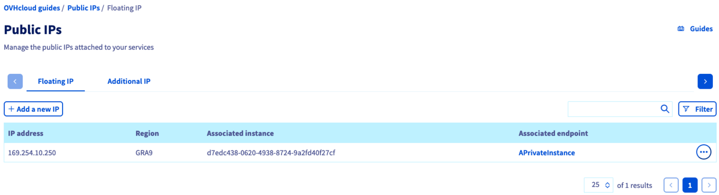 In the OVHcloud Control Panel, in the Public Cloud section, go to the Network section of the left-hand menu and select Public IPs. Here you can manage Additional IP and Floating IP addresses according to your needs.