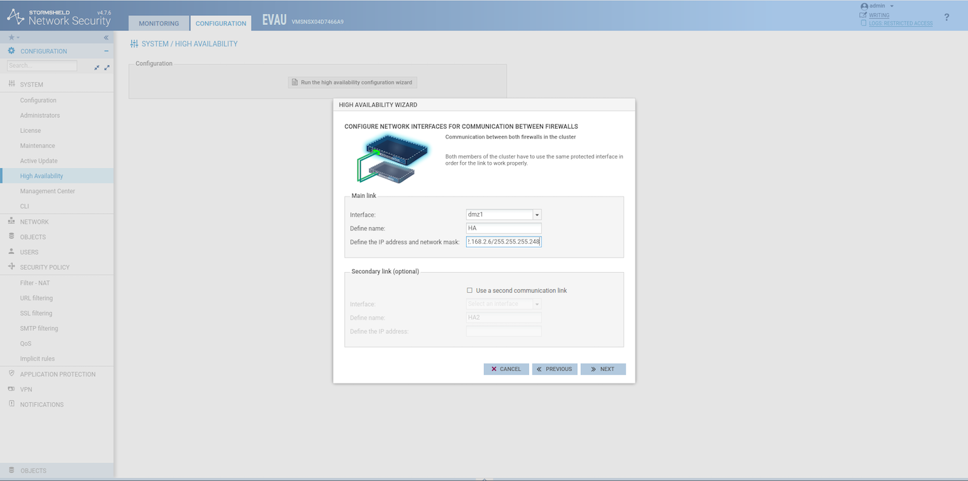 En el primer SNS EVA, cree un grupo de firewall (Configuration > System > High Availability). En cuanto a la dirección IP, compruebe qué IP ha asignado el DHCP OpenStack a la interfaz HA.