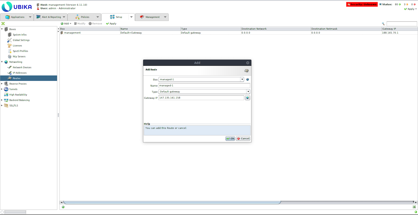 Remove the default gateway and add the vRack gateway for each managed Ubika (Setup > Networking > Routes).