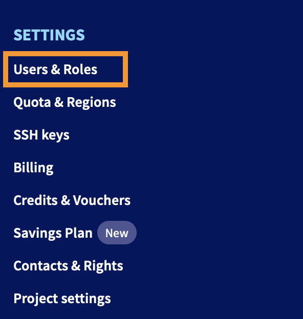 To apply these roles, log in to the OVHcloud Control Panel and navigate to the Public Cloud section. Select your Public Cloud project and click on Project Management > Users & Roles: