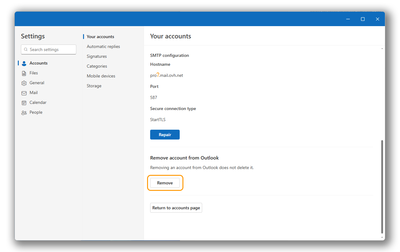 Si su cuenta de correo ya está configurada y desea modificar sus parámetros, deberá eliminarla y volver a crearla: