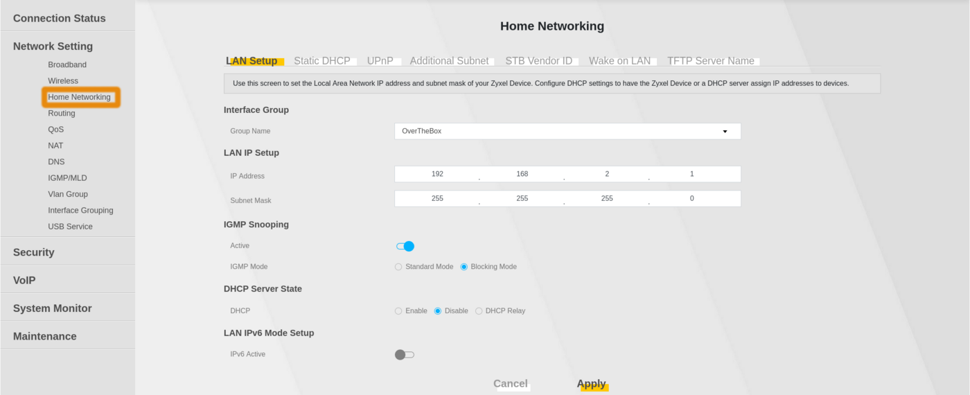 Accédez maintenant à la page Home Networking qui se trouve également dans le menu Network Settings. Depuis cette page, il vous faut désactiver le DHCP du modem sur le groupe OverTheBox, afin que le serveur DHCP utilisé soit celui de l'OverTheBox.