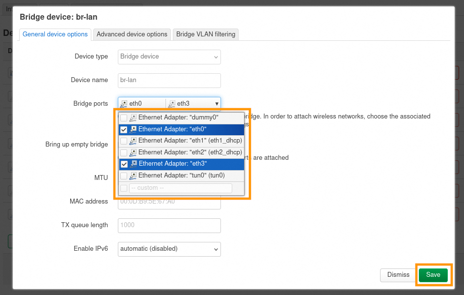 Modifiez le bridge br-lan à l'aide du bouton Configure....