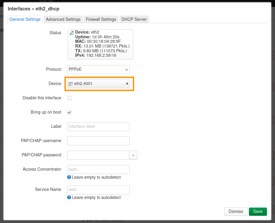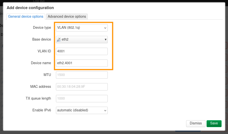 Dans le paramètre Device, renseignez le device créé lors de l'étape précédente. Pour notre exemple, eth2.4001.