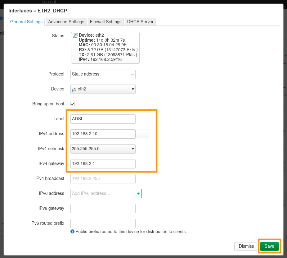 Dans le paramètre IPv4 address, renseignez l'IP statique que l'OverTheBox doit utiliser (cette IP ne doit pas être déjà utilisée). Pour notre exemple, 192.168.2.10.