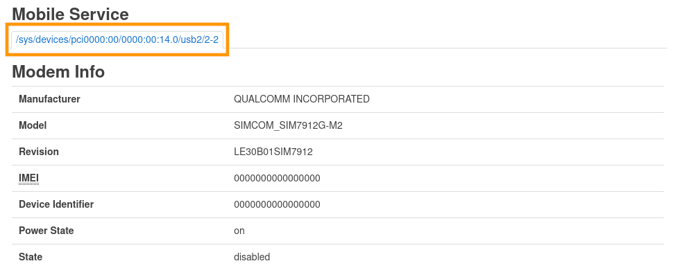 Dans le paramètre Modem Device, choisissez le device récupéré à l'étape 1. Pour notre exemple, /sys/devices/pci0000:00/0000:00:14.0/usb2/2-2.