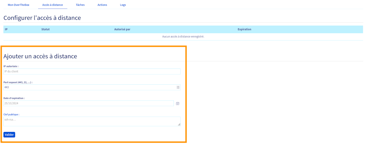 Port exposé : Port de l'OverTheBox qui sera contacté lors de l'accès à distance. Choisissez 443 pour un accès à distance via le navigateur ou 22 pour un accès via SSH.