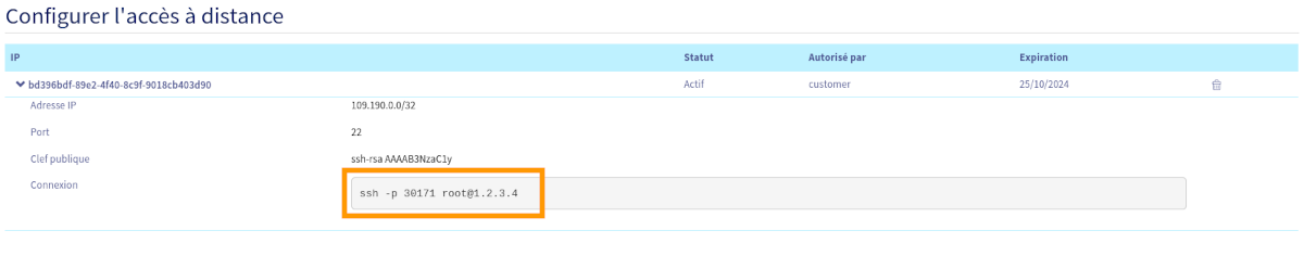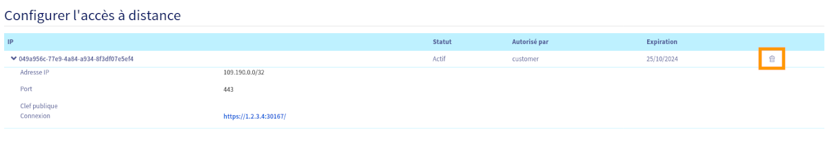 Vous pouvez supprimer un accès à distance en cliquant sur le symbole en forme de poubelle.
