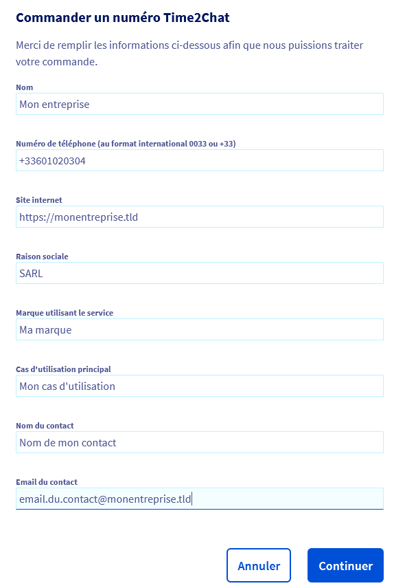 Ces éléments permettent de personnaliser votre numéro Time2Chat et de garantir le bon fonctionnement des échanges bidirectionnels entre votre marque et vos clients.