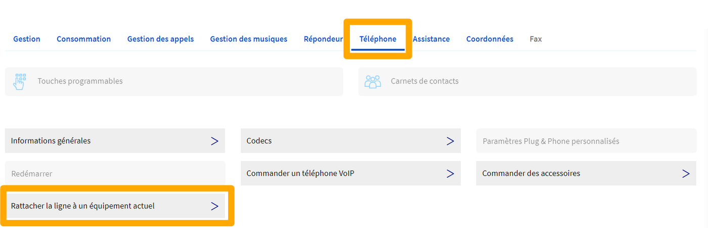 Positionnez-vous ensuite sur l'onglet Téléphone et cliquez sur Rattacher la ligne à un équipement actuel.