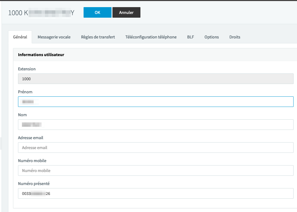 Dans le champ Numéro présenté, saisissez le DDI à présenter. Dans notre cas : 0033XXXXXXX26.