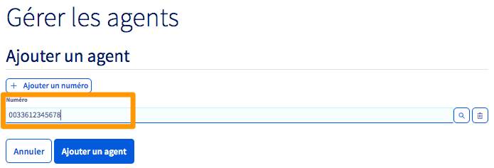 Afin de créer vos files d'appels, vous devez d'abord ajouter toutes les lignes qui pourront être contactées lorsque votre numéro alias sera appelé. Ces lignes sont ici désignées comme des agents.