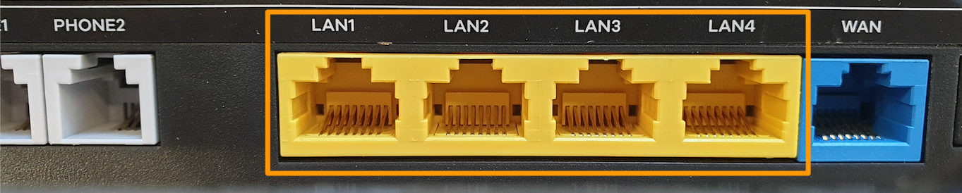 Sur votre routeur / modem / Box Internet, le câble doit être raccordé à l'un des ports « SW » (pour switch). Sur une Box grand public, il s'agit fréquemment d'une série de 4 ports identiques, souvent d'une même couleur, comme dans l'image ci-dessous.