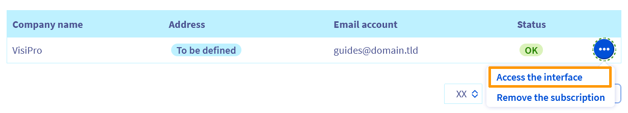 Pour accéder à l'interface de gestion de la solution Visibilité Pro, cliquez sur le bouton représentant trois points à droite de la ligne concernée, puis sur Accéder à l'interface.