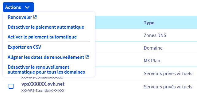 Si vous ne souhaitez pas de renouvellement automatique et donc de prélèvement automatique, vous pouvez modifier le type de renouvellement pour certains produits (Domaines, Hébergements, VPS, Serveurs dédiés) et les passer en renouvellement manuel .
