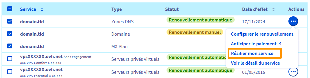 Selon le service, s'il est éligible ou non au renouvellement manuel, certaines actions ne seront pas disponibles.
