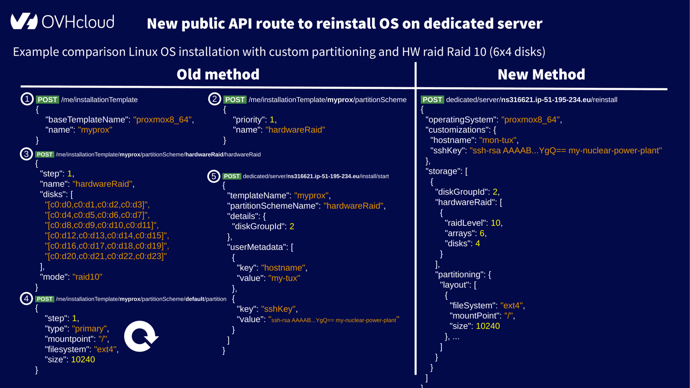 Afin de simplifier l'installation des OS sur les serveurs dédiés, ainsi que pour simplifier la communication de ce changement, un nouvel appel API a été créé : POST /dedicated/server/{serviceName}/reinstall. Cet appel API est le successeur de l'ancienne route : POST /dedicated/server/{serviceName}/install/start. Cette ancienne route permettait de cibler une installation OS depuis un gabarit OVHcloud ou un gabarit personnel.