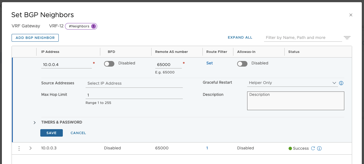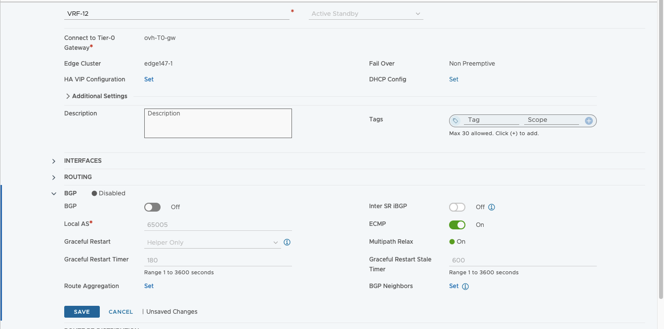 Actuellement la fonctionnalité des nombres AS n'est pas disponible au niveau VRF. Elle le sera avec la version 4.1.1 de NSX. L'AS est 65000 sur les deux PCC si vous ne modifiez rien, car il est configuré nativement au niveau T0 par l'automatisation.