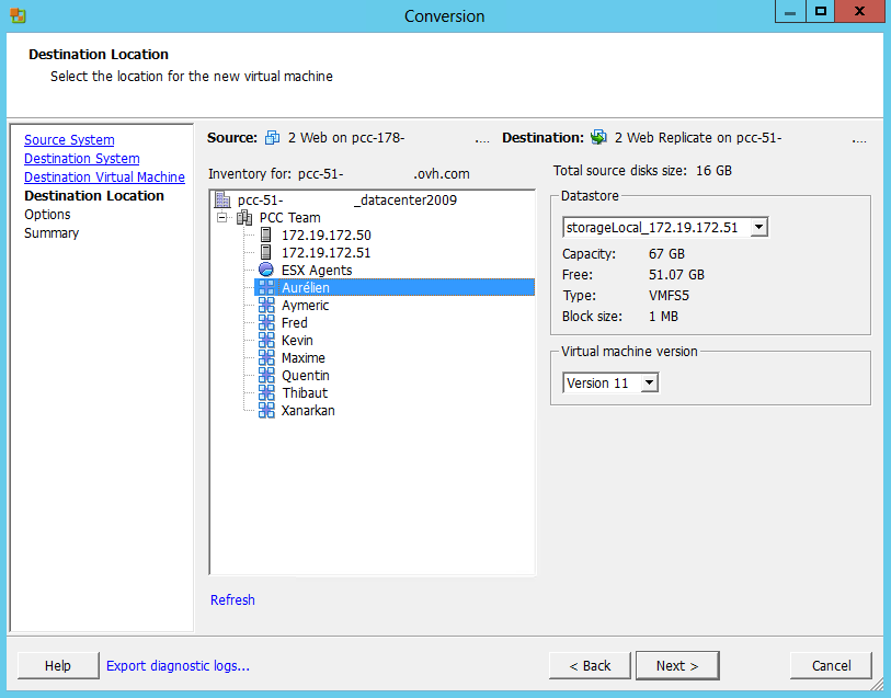 Vous pouvez ensuite renommer la VM qui va être créée par conversion et choisir un répertoire.