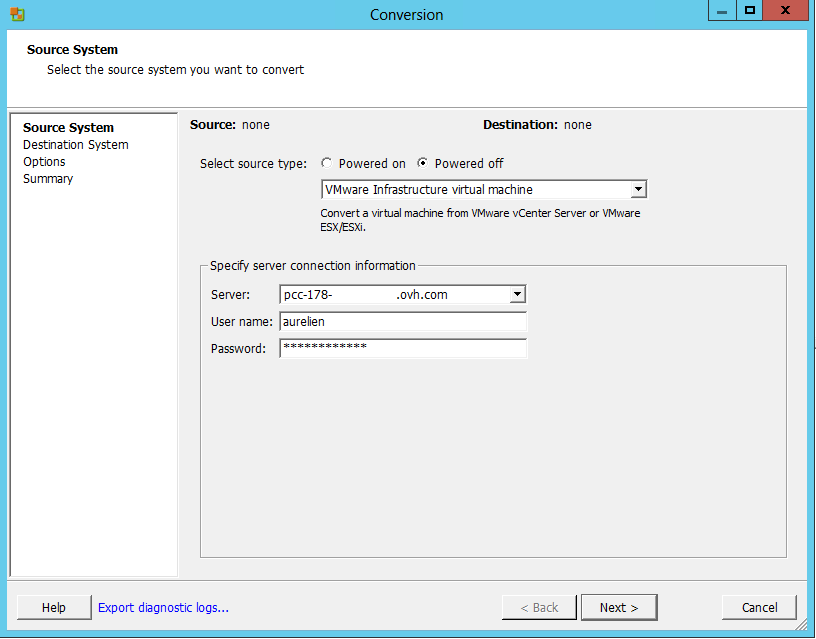 Dans le menu déroulant sélectionnez "VMware Infrastructure.." et renseignez le nom de votre source (ici notre Private Cloud) ainsi que votre utilisateur et mot de passe.