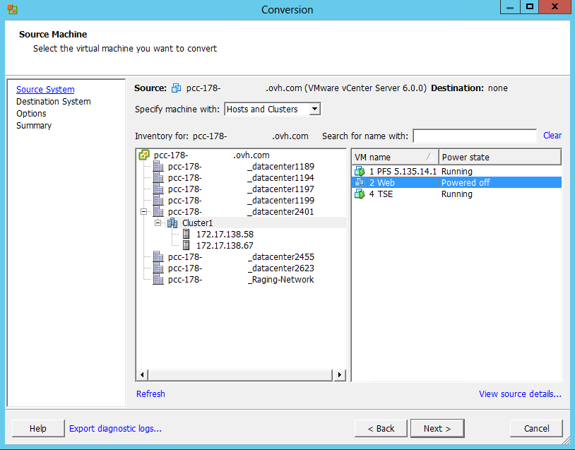 Choisissez la machine virtuelle à convertir (obligatoirement éteinte dans notre cas). Nous prenons ici l'exemple de la VM "2 Web".