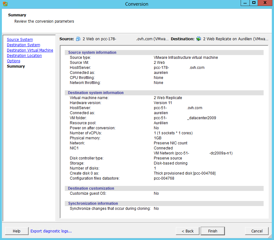 Vous pouvez ensuite modifier les paramètres de la VM de destination si nécessaire, par exemple si un réseau est différent.