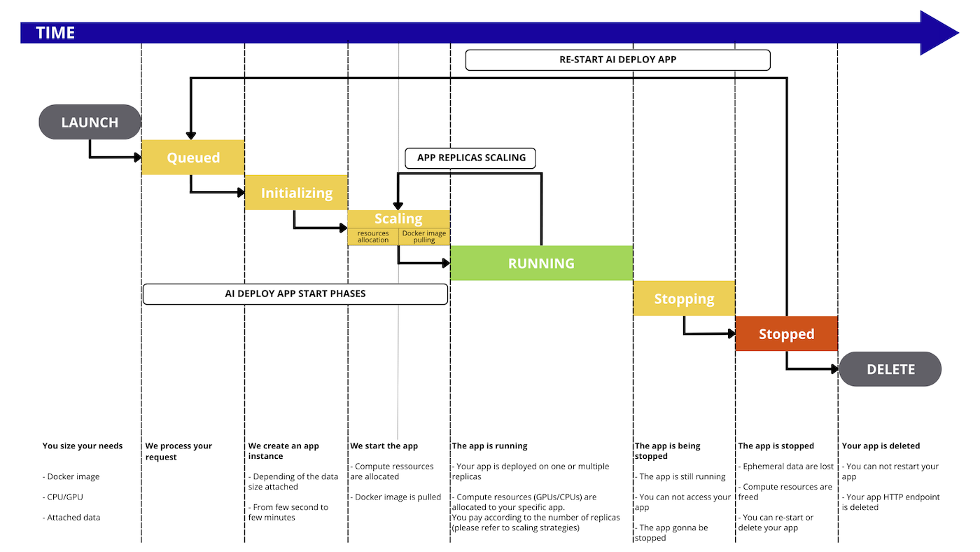 QUEUED: the app deployment request is about to be processed.INITIALIZING: the app is being started and, if any, the remote data is synchronized from the Object Storage. To learn more about data synchronization, please check out the Data - Concept and best practices documentation.SCALING: First, the system allocates the necessary compute resources (CPU/GPU) for the app. Then, the specified Docker image is pulled for use in the app. This status is also entered when the number of app replicas is being increased or decreased.RUNNING: At least one replica of the app is available and accessible via its endpoint. As the app scales up to create new replicas, the status transitions back toSCALING. However, there is no interruption in service, and the original replica(s) remain accessible during this time.STOPPING: the app is stopping, your compute resources are freed. Ephemeral data is deleted.STOPPED: the app ended normally. You can restart it whenever you want or delete it. It will keep the same endpoint.FAILED: the app ended in error, e.g. the Docker image is invalid (unreachable, built with linux/arm, ...).ERROR: the app ended due to a backend error (issue on OVHcloud side). You may reach our support.DELETING: the app is being removed. When it is deleted, you will no longer see it, it will no longer exist.DELETED: the app is fully deleted.