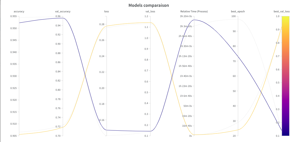 In our case, we will be able to track the evolution of different models based on the values of accuracies and losses. The tool also offers us the possibility to visualise the training times and the consumption of resources (GPU).