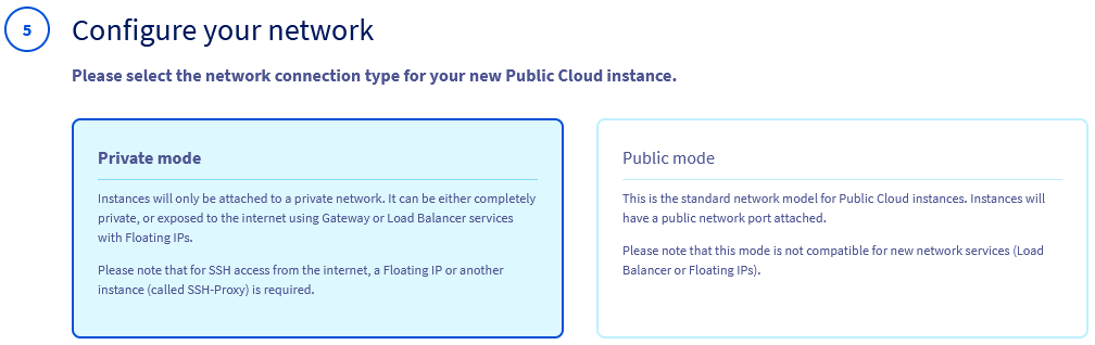 Dans cette étape, vous devez appliquer le mode de réseau Public Cloud que vous avez décidé, en fonction des informations de l'étape 3 ci-dessus. Vos options dépendent du choix de l'emplacement précédent pour l'instance (Région ou Local Zone).