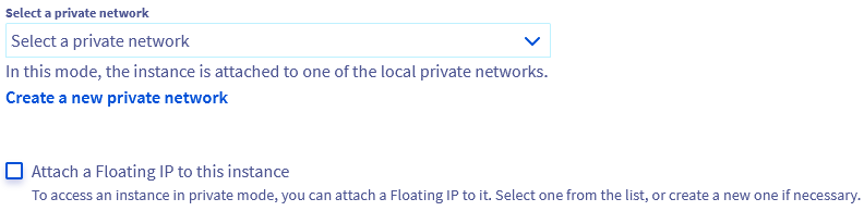 Vous pouvez connecter l'instance à un réseau privé et une Floating IP. Aucune adresse IP publique dédiée ne sera attachée.
