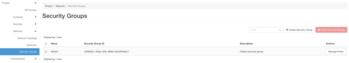 Ajoutez un groupe de sécurité en cliquant sur Create Security Group, puis appliquez-lui des règles personnalisées ou prédéfinies via le bouton Manage Rules dans le tableau.