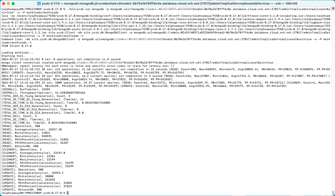 Take note of the value of the members.name field for that element. eg. name: 'node2-0b70a1b78fff6c0e-admin.database.cloud.ovh.net:27017'. You will use it in STEP 4 to load and run YCSB.
