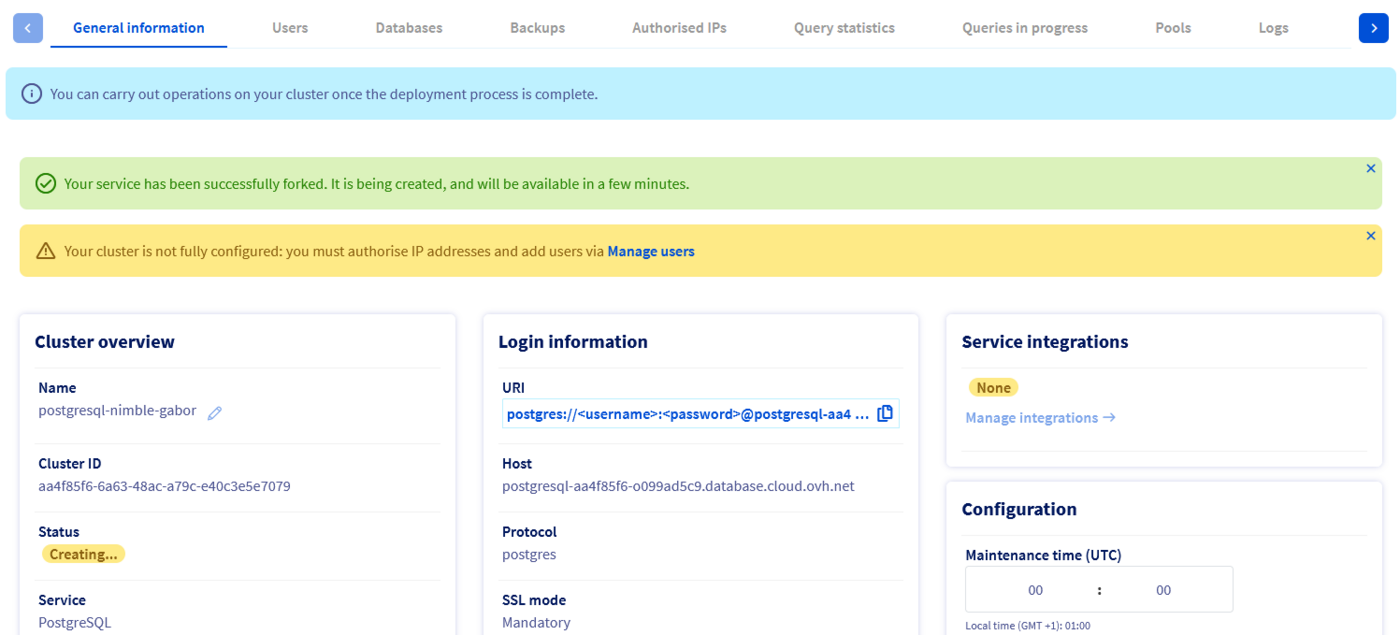 Now click on Create a fork and the new service will be created. Please note that depending on the backup size, it can take some time before the service is available.