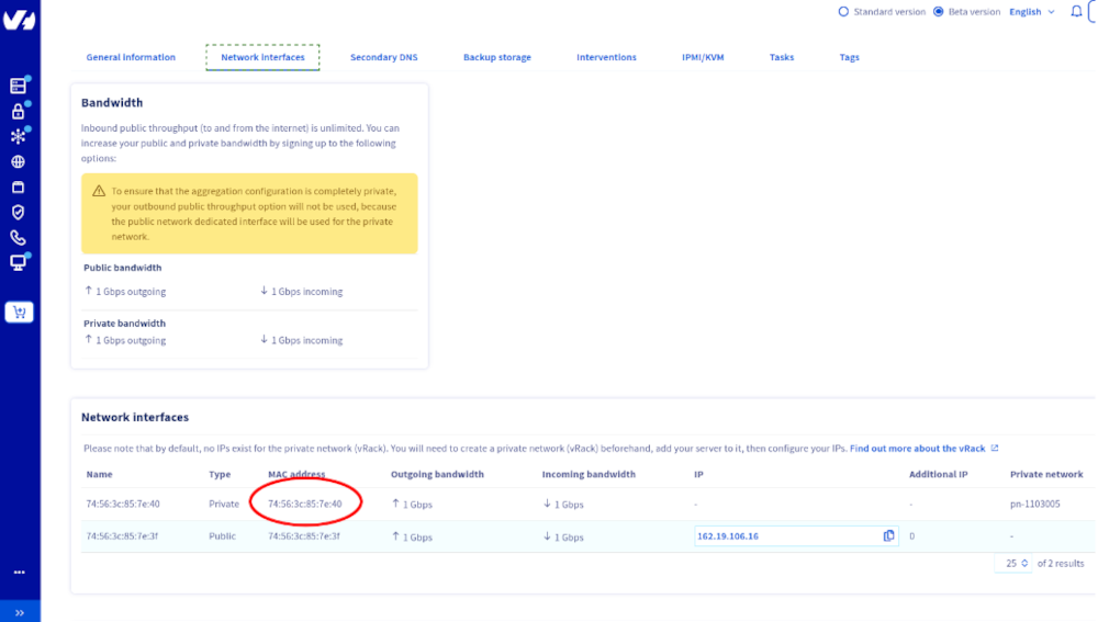 2. Récupérez l'adresse MAC de l'interface privée du serveur Bare Metal.