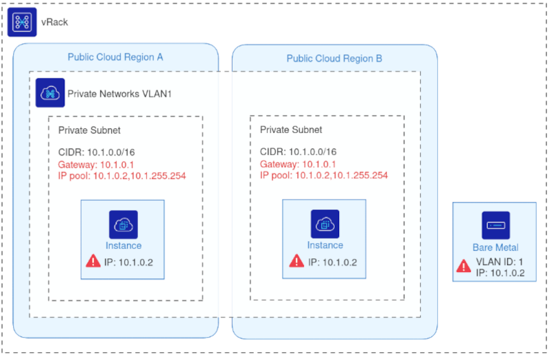 Les instances Public Cloud reçoivent automatiquement leurs adresses IP privées via le DHCP OpenStack ou cloud-init, et ce mécanisme ne peut pas être désactivé. En même temps, tous les réseaux privés utilisant le même VLAN à l'intérieur d'un vRack doivent partager un espace d'adressage commun. Cela signifie qu'en l'absence d'une planification appropriée, le même VLAN peut finir par attribuer des adresses IP chevauchantes ou identiques à travers les régions ou entre différents services OVHcloud.