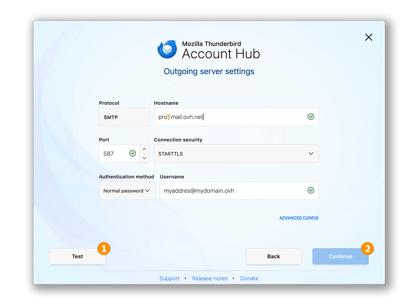Lorsque Thunderbird détecte un nom de domaine OVHcloud, une configuration automatique relative à l'offre MX Plan est proposée. Cliquez sur MODIFIER LA CONFIGURATION.