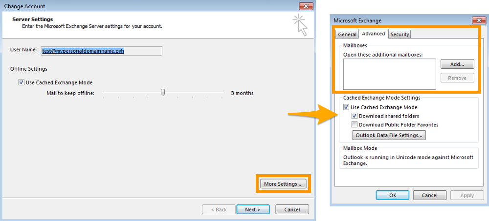 Cliquez à présent sur Paramètres supplémentaires. Dans la nouvelle fenêtre, positionnez-vous sur l'onglet Avancé puis cliquez sur Ajouter. Renseignez le nom du compte pour lequel vous bénéficiez du droit délégué puis validez l'ajout jusqu'à son terme. Le compte s'affiche alors dans le menu de gauche de votre logiciel, vous permettant d'en explorer son contenu.
