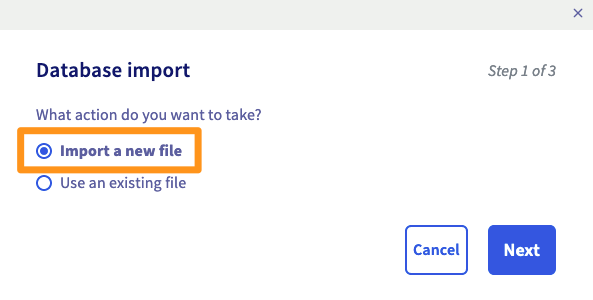 Depuis l'onglet Bases de donées, cliquez sur le pictogramme en forme de roue dentée puis sur Importer un fichier. Sur la fenêtre qui s'affiche, cochez la case Importer un nouveau fichier puis cliquez sur Suivant.