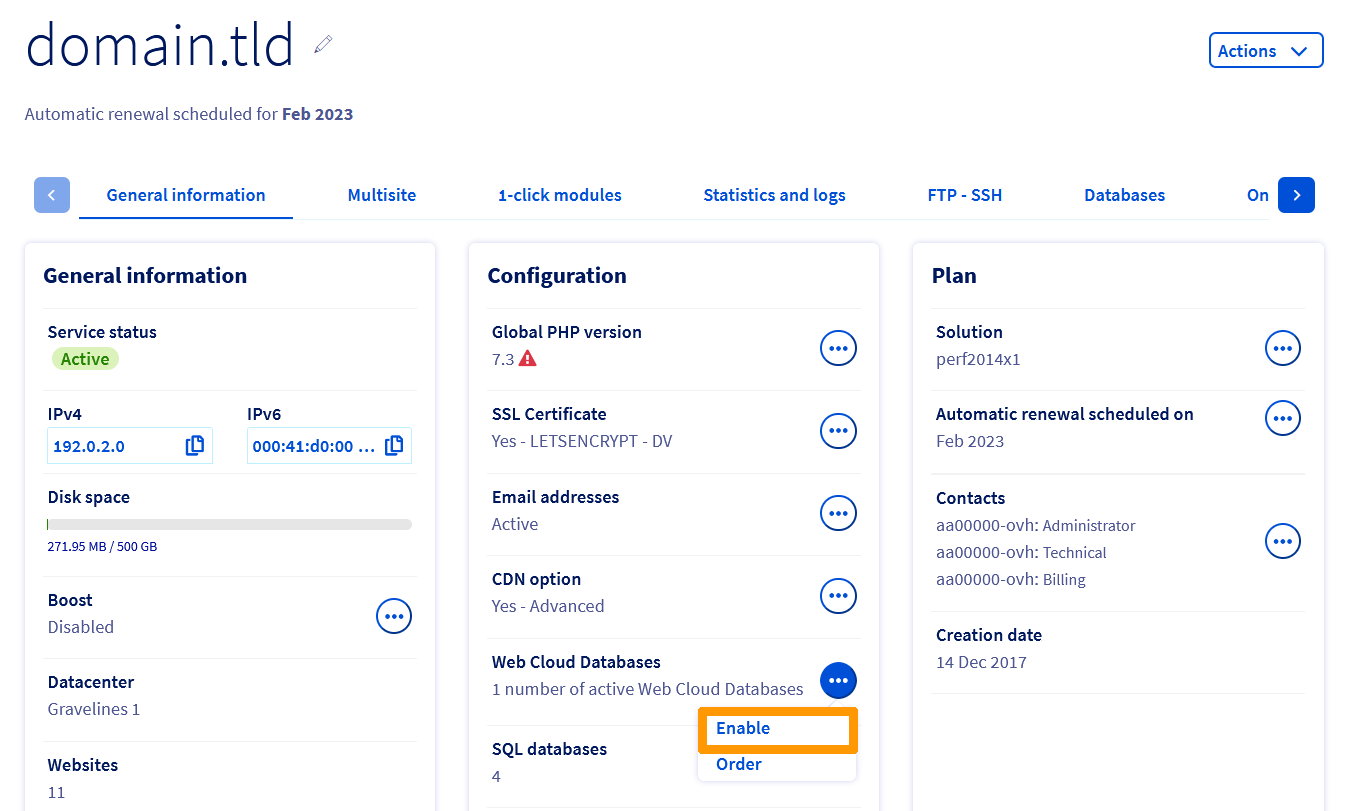 Activation de votre serveur Web Cloud Databases inclus avec votre offre d'hébergement web