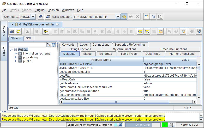 - URL : Indiquez l'adresse du serveur et le port sous la forme jdbc:postgresql://server:port/database
