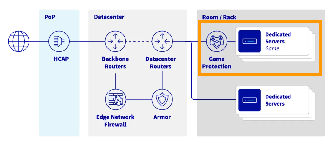 L'infrastruttura anti-DDoS, associata a Edge Network Firewall, protegge la rete dalle minacce più comuni (concentrate principalmente sui livelli ISO OSI 3 e 4). L’hosting di applicazioni di gioco può rivelarsi un’esperienza difficile in termini di sicurezza di rete. Game DDoS Protection è un firewall Layer 7 (applicazione) che si concentra sulla protezione di protocolli di gioco specifici. I principali vantaggi sono: