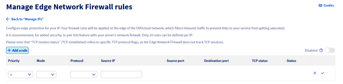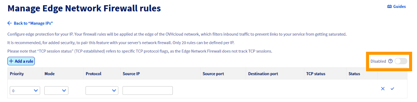 Se hai configurato delle regole, ti consigliamo di verificarle regolarmente o in caso di modifiche al funzionamento dei tuoi servizi. Come accennato in precedenza, Edge Network Firewall verrà attivato automaticamente in caso di attacco DDoS, anche se è disattivato nelle impostazioni IP.