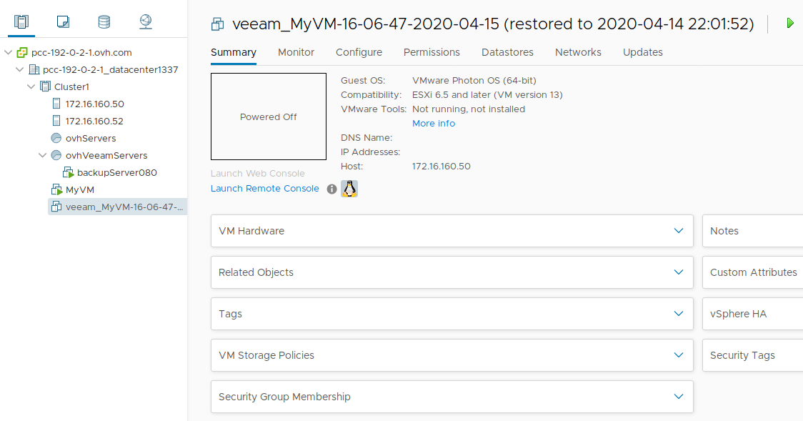 Note that the restored machine is connected to the network. If you start the VM without turning off the source VM, there may be an IP address conflict.