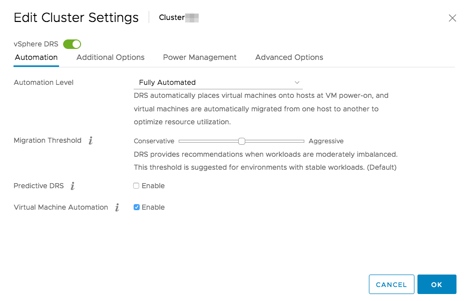 - Partially Automated: DRS will advise you on migrating your VMs, but will only do so if you validate the move.