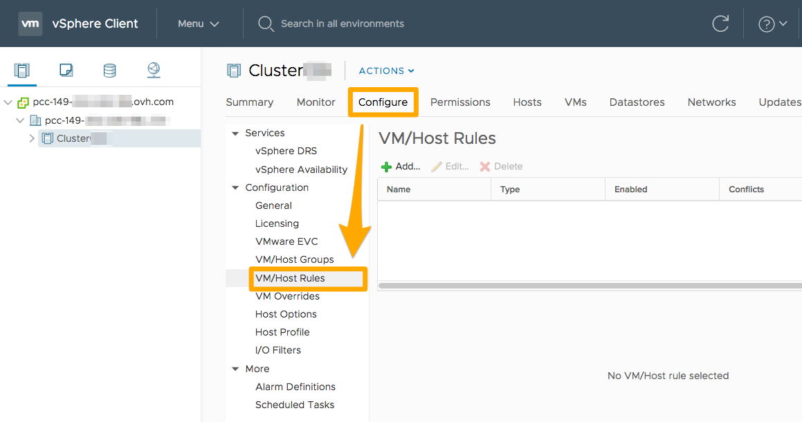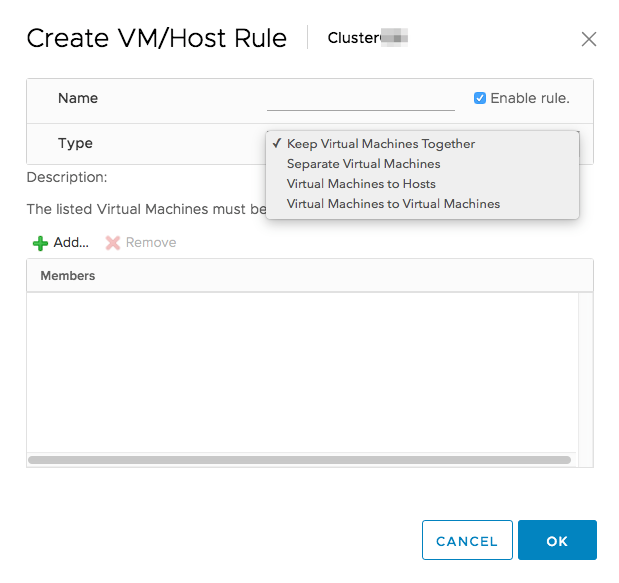 - Virtual Machines to Hosts: VMs that are members of the VM group of the specified cluster must run on the specified host group. It is necessary to create VM and host groups in the