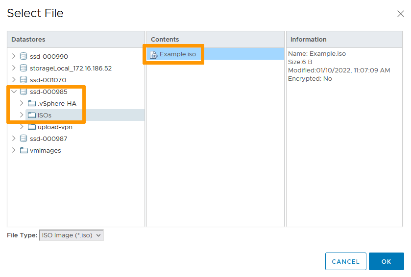 You can refer to the guide Upload an ISO to a datastore for more information on uploading elements (ISO, files, etc.) to your VMware on OVHcloud environment.